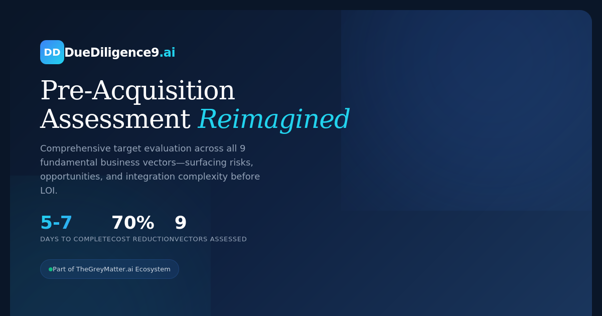 • DueDiligence9.ai — Pre-acquisition target assessment