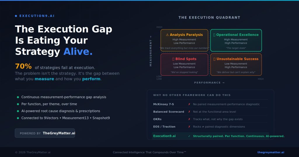 Execution9.ai was built to solve exactly that problem. It’s the only AI-powered platform with measurement-performance gap analysis structurally embedded in its architecture — because it’s built on the only diagnostic framework where that pairing is an inherent design element, not a bolted-on feature.