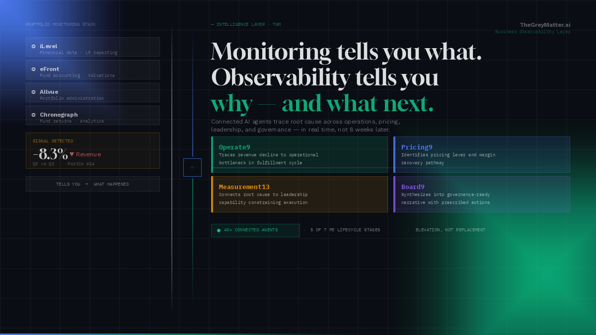 That is the vision behind TheGreyMatter.ai — the business observability layer that sits on top of your existing portfolio monitoring stack and transforms financial reporting into connected, prescriptive intelligence.