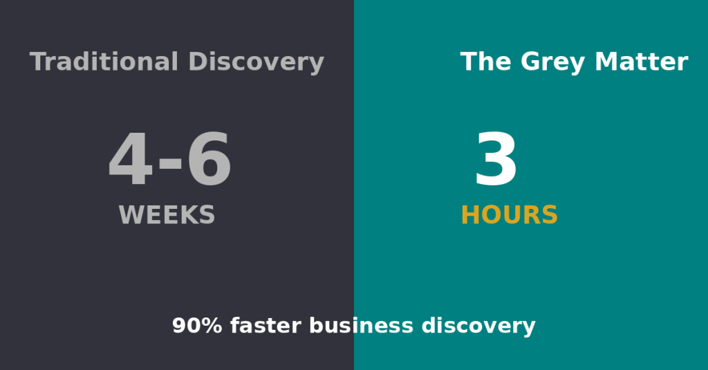 POST CONTENT: Traditional business discovery: 4-6 weeks. The Grey Matter AI discovery: 3 hours. Same depth. 90% faster. Time is your most valuable resource. Stop…